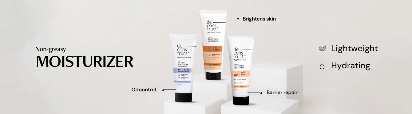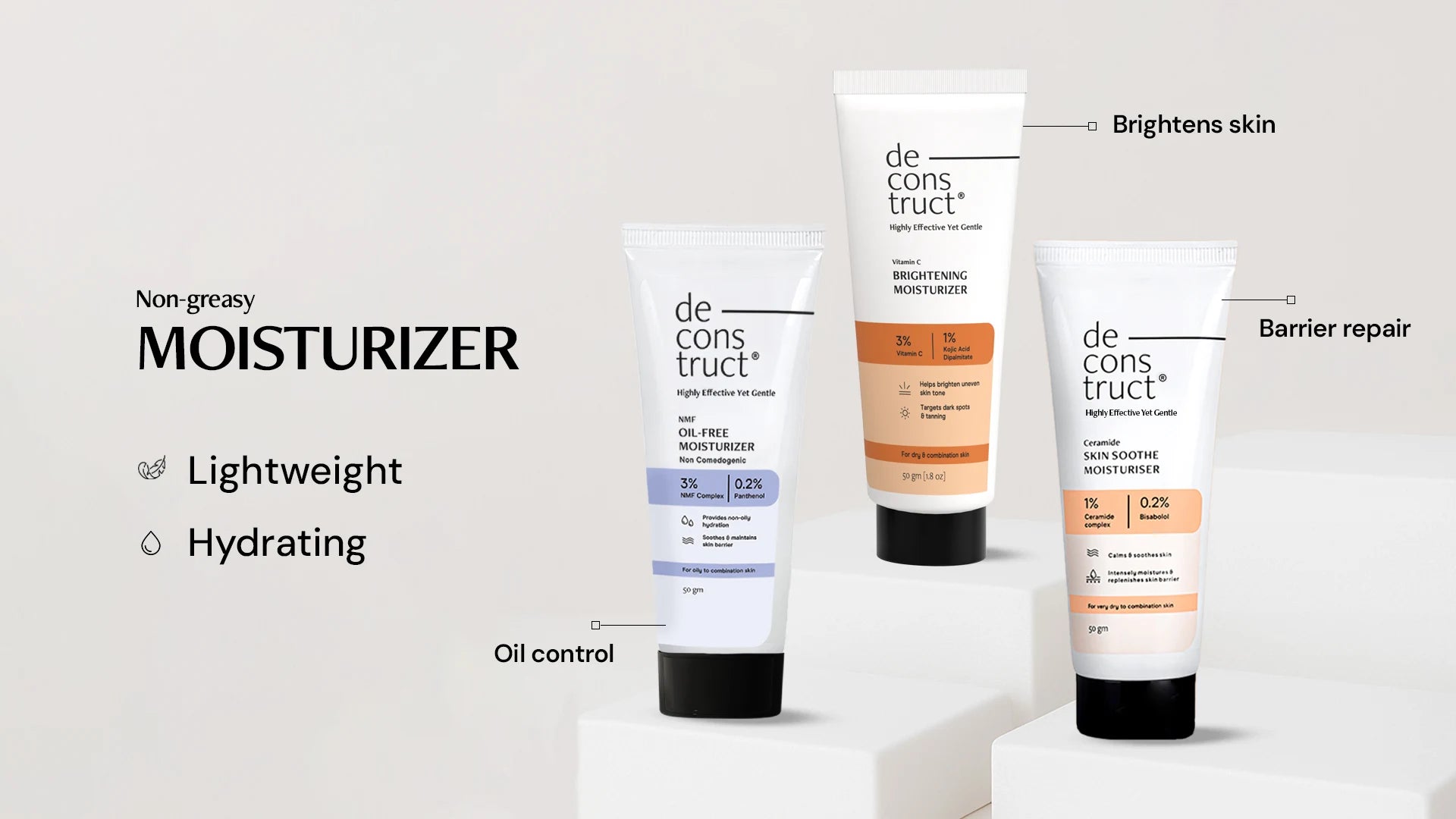 The right moisturizer is the base of every effective skincare routine. It's the one indispensable daily practice that can give long-term benefits like improving skin texture, radiance, barrier protection, and more. But only the right pick for your skin type can bring forth desirable results. Deconstruct has a range of moisturizers for men and women formulated for different skin types. We are here to help you cut through the confusion and make the right skincare choices.