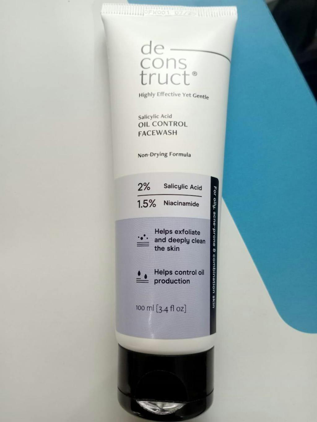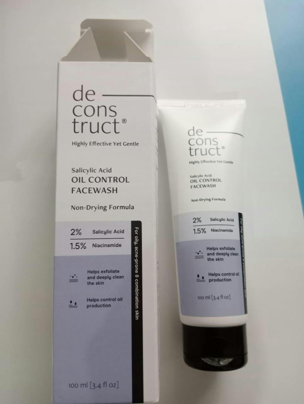 The Deconstruct Salicylic Acid Oil Control Face Wash is a gentle, non-drying cleanser for oily skin, formulated with 2% Salicylic Acid and 1.5% Niacinamide to deeply cleanse, remove excess sebum, and unclog pores without drying or irritating the skin. It gently exfoliates the skin, making it one of the best face washes for oily, combination, and acne-prone skin. The formula is non-irritating, safe for sensitive skin, and non-comedogenic. It penetrates pores to clear out buildup, reduce blackheads and whiteheads, and help prevent breakouts. Salicylic Acid exfoliates gently to smooth skin texture, while Niacinamide helps regulate sebum production. Its cooling, non-stripping formula leaves the skin feeling clean, refreshed, and balanced after every use.